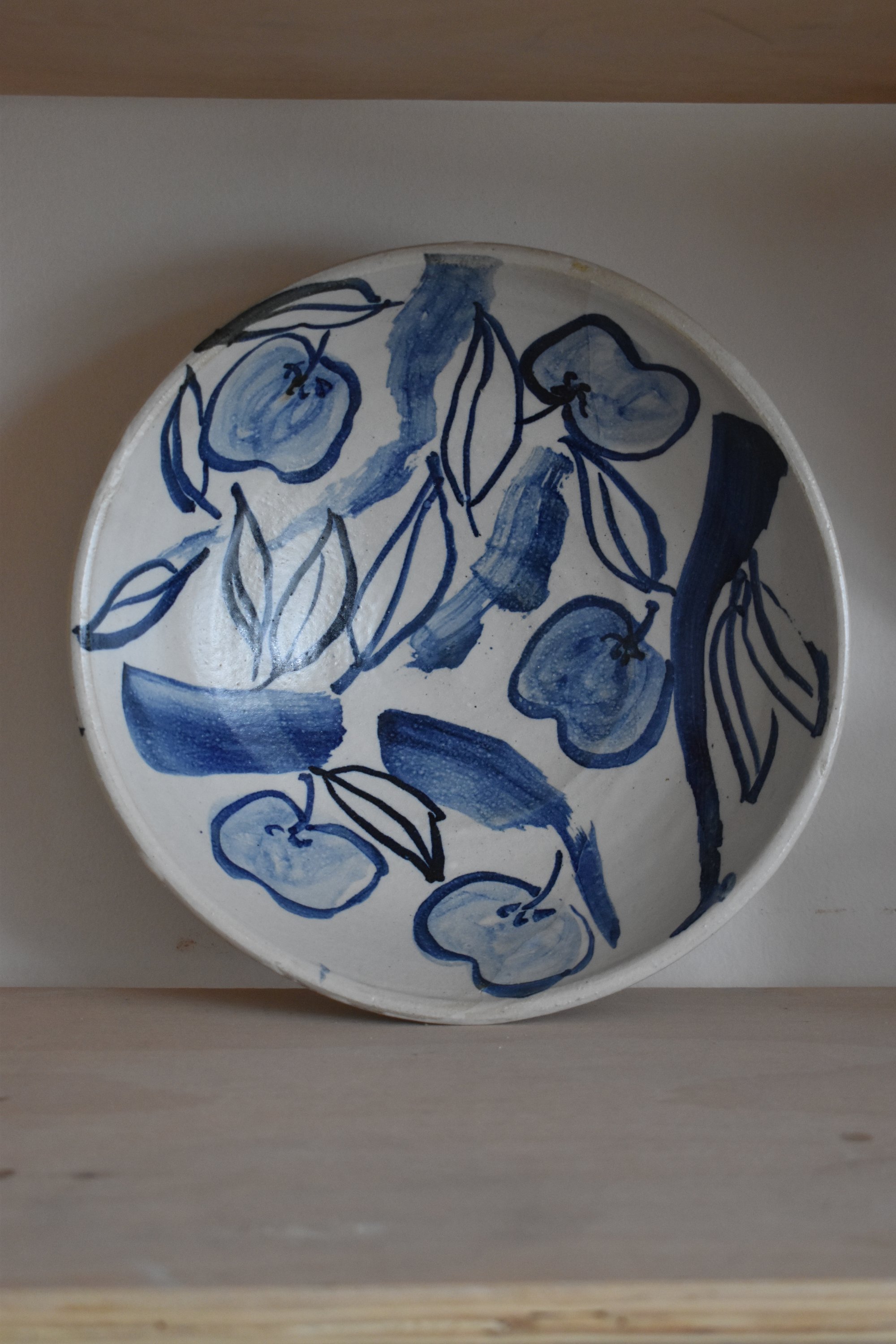 A stoneware serving bowl illustrated with apples and leaves in cobalt blue.