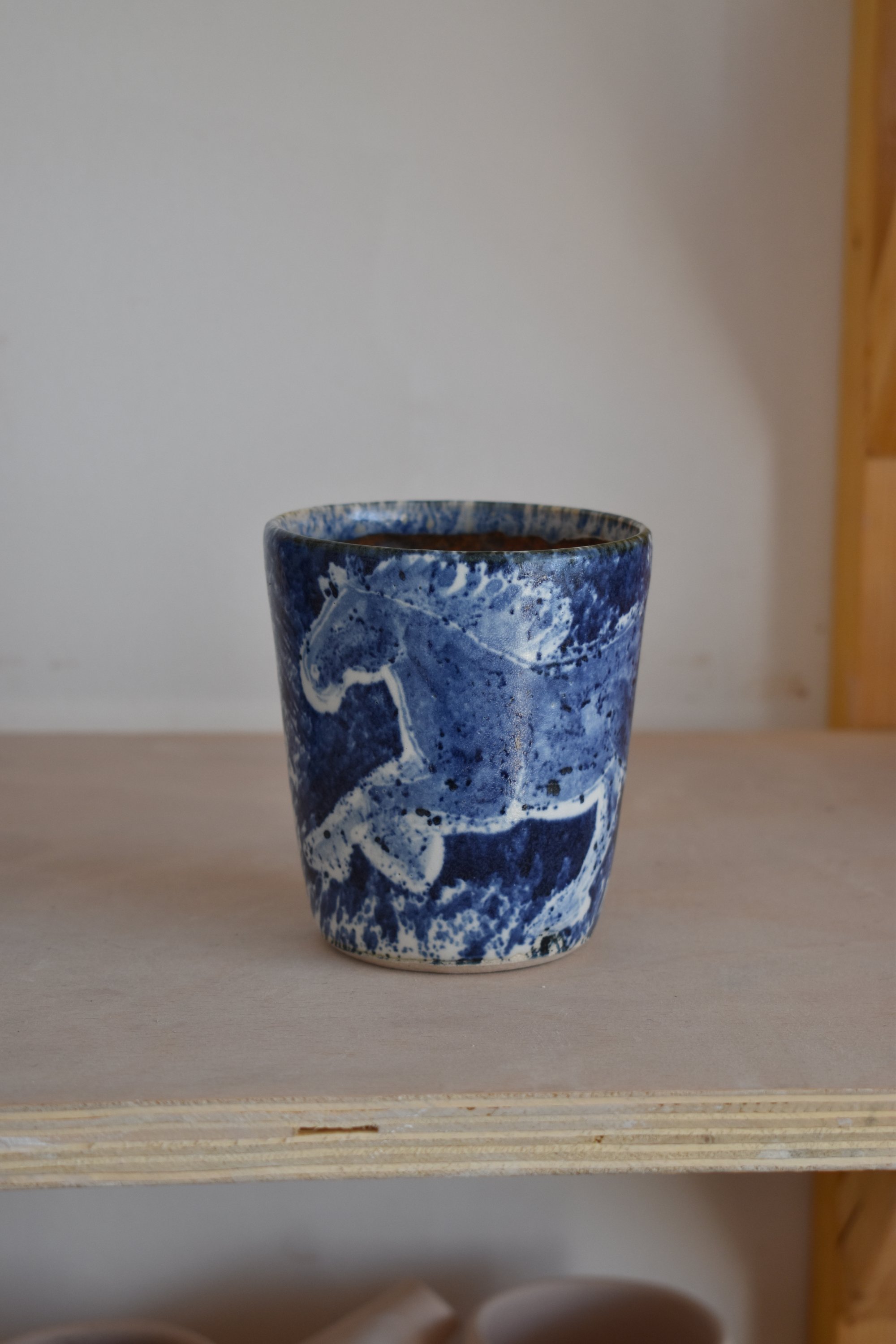 Glazed in a satin white with oxide illustrations in blue and details scratched back into the surface. The interior of the tumbler is orange with some blue splatters. This design has a lot of movement within it, please note that there is variation in the design between tumblers.