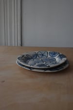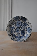 A stoneware side plate illustrated with nasturtium flowers and leaves. Two available, not a perfectly matched pair and both with uneven bases