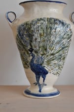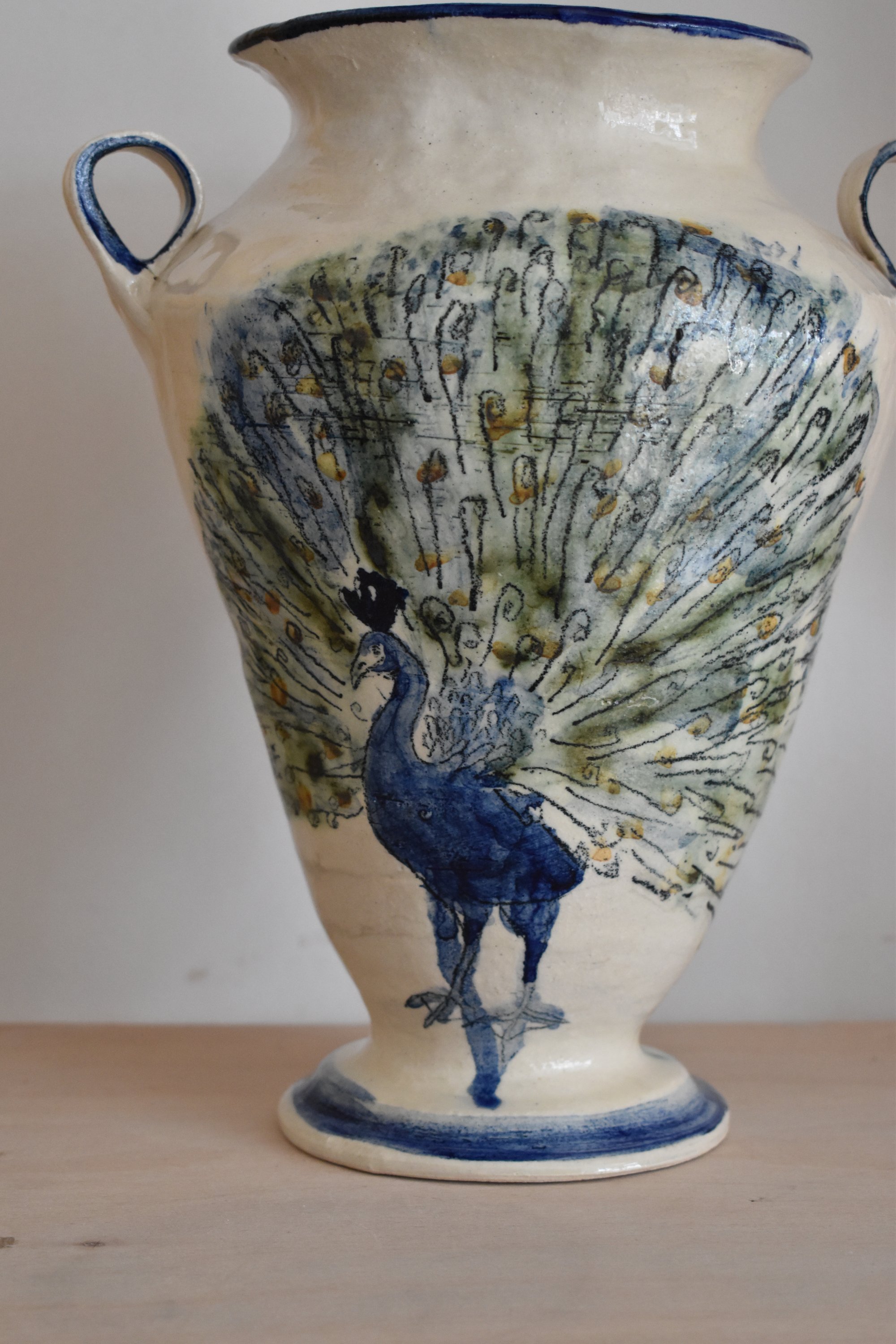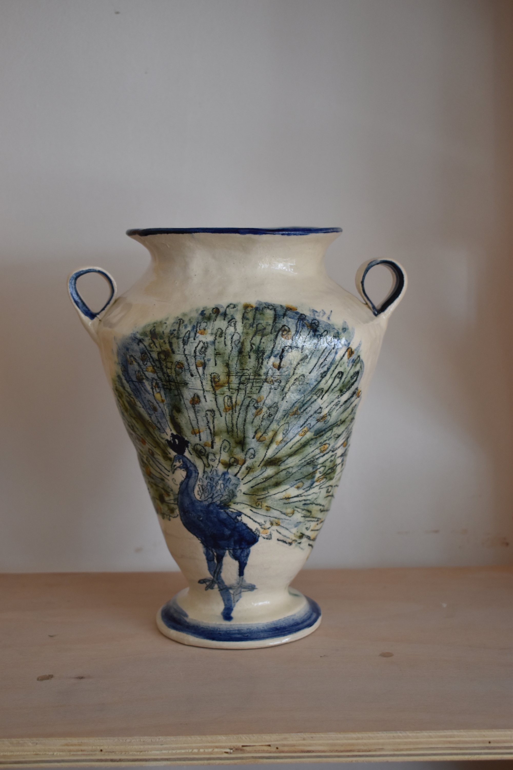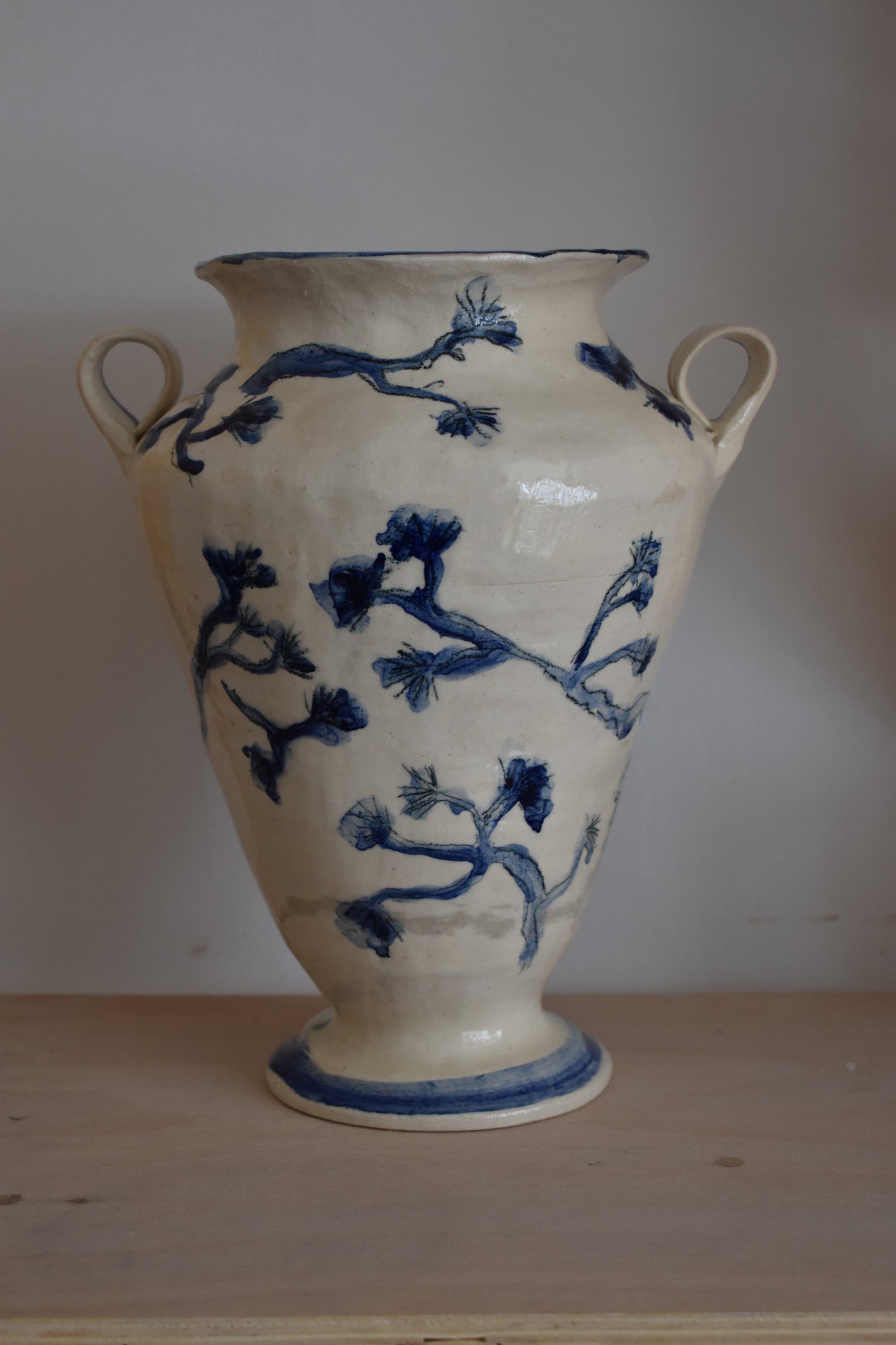 An amphora-style vase with ceramic pencil and oxide illustration.