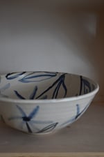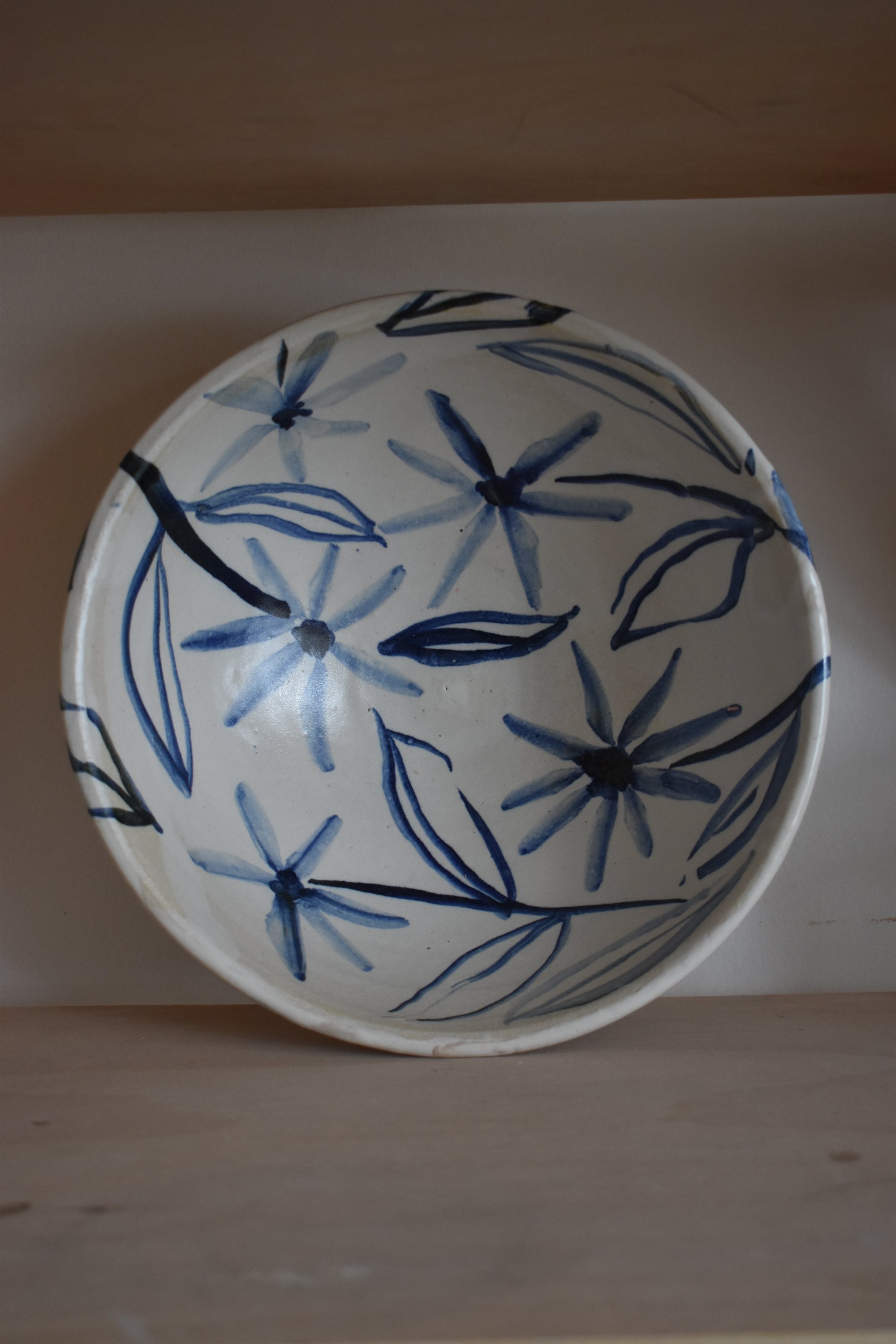 A stoneware serving bowl illustrated with rudbeckia flowers and leaves in cobalt blue. Small crack in base of bowl, reglazed but still visible.