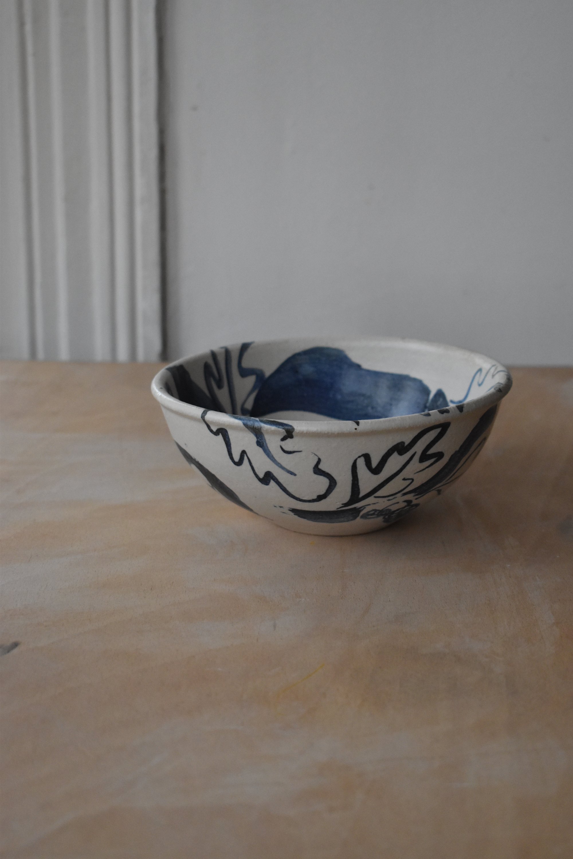 A stoneware serving bowl illustrated with oak leaves and acorns in cobalt blue. Two available, not a perfectly matched pair