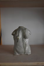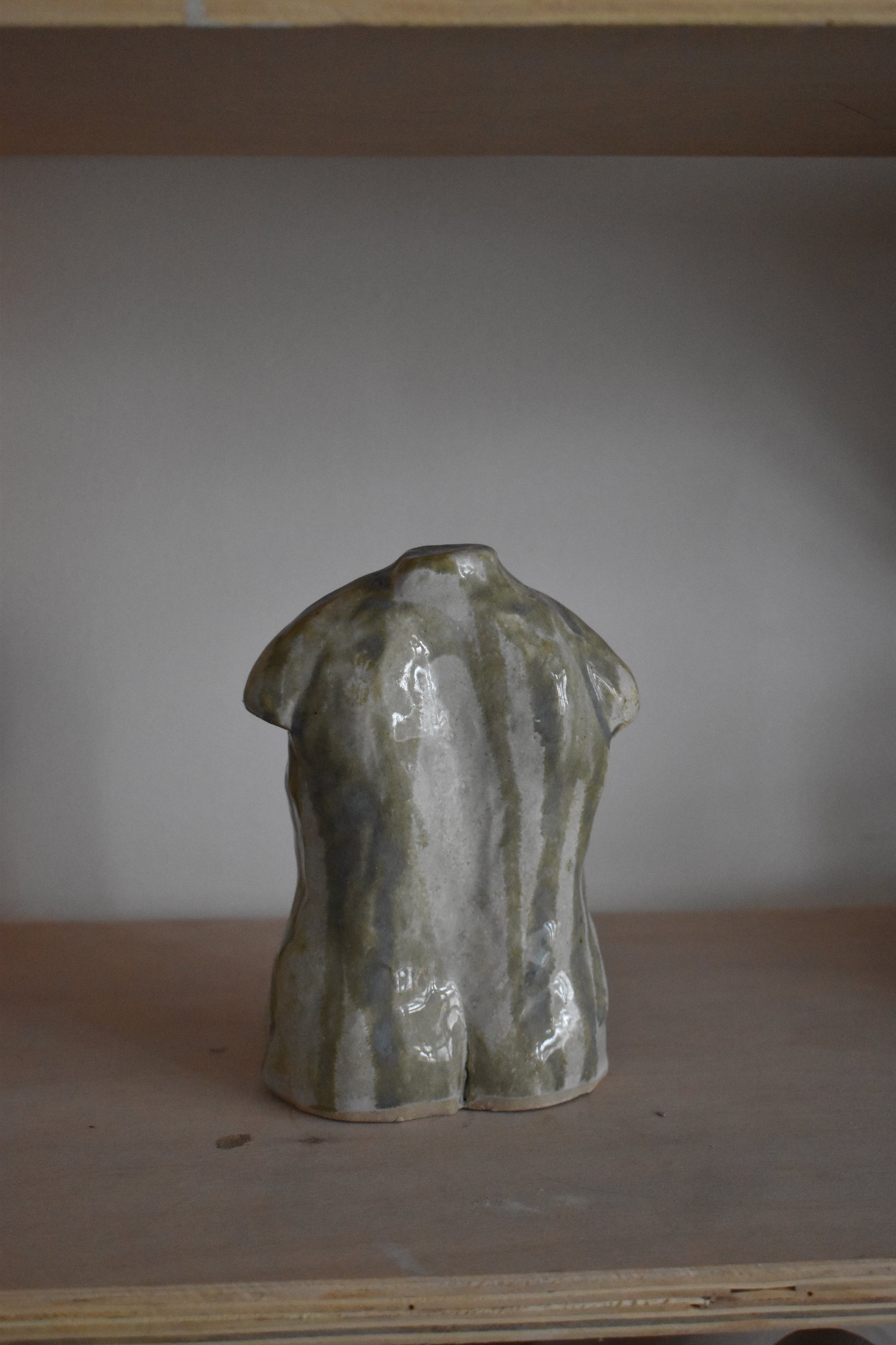 A large stoneware bust of a female torso, hand-built and finished in a dripping green glaze.